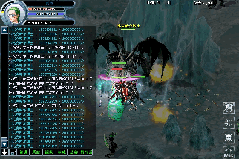 它会使用的魔法和技能在所有怪物中最多,冰,火,雷,天降神兵,双龙戏珠都会用,也会用必杀,必杀的伤害力会比普通魔法的伤害力提高20%,它也会自我医疗,传送,心灵风暴,传送是把自己正在远程攻击的目标拉回到自己身边,它也可以麻痹,诅咒敌人或使敌人中毒,上图中的比克哈尔博士正在同时使用物理攻击,必杀,心灵风暴,麻痹,中毒,诅咒,被诅咒的标志是右边的那个骷髅头。