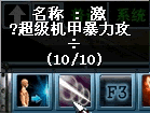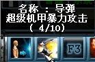 超级机甲Ver.1和Ver.2可以装置零部件,装置导弹或激光后魔法窗口会出现导弹或激光的图标,将图标放入指定的快捷键中就可以随意发射导弹或激光啦,当导弹或激光耗尽时,导弹或激光会自动消失。