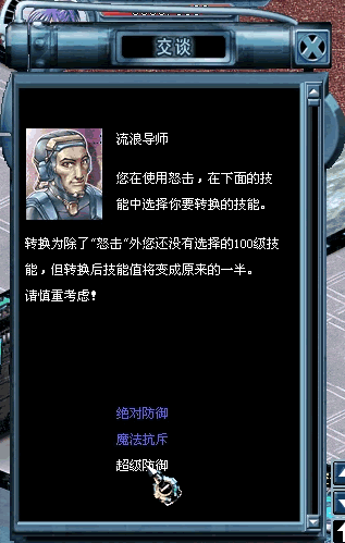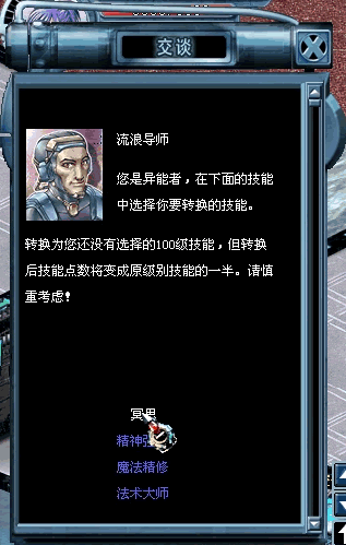在NEO A.R.K隐居着一位流浪导师,他掌握着一种独有的,特有的高科技技术——技能转换,进行技能转换等级至少需要在120级以上,通过技能转换,您能够将一个普通技能转换为百级技能,以此同时拥有两项百级技能,也就是说比如您是法师,百级技能已经选择了怒击,那么您还能够将一个普通技能比如冥思转换为百级技能超级防御,但是不能同时拥有两项相同的百级技能,比如不能同时拥有两个百级技能怒击,进行技能转换时,您首先需要将第一个百级技能选择,就是人物属性栏中显示“问号[?]”的那个技能,也就是最后一个技能,然后再挑选一个欲转换的普通技能用于技能转换,但是如果欲转换普通技能的技能点数不足1,则不能使用该普通技能进行技能转换,比如您是法师,您选择了将普通技能冥思用于技能转换,但是普通技能冥思的技能点数不足1,此时该普通技能冥思就不能用于技能转换,普通技能经转换后所成为百级技能的技能点数为进行技能转换前该普通技能技能点数的一半,另外,技能转换只能进行一次,若要再次进行,则需要使用圣药或魔还丹等重洗技能点,进行技能转换的过程其实非常简单,只有两步: