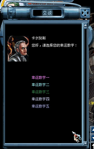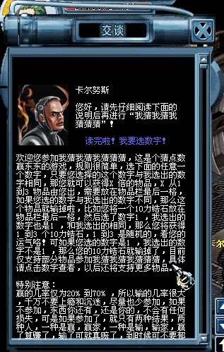 我猜我猜我猜猜猜,小“猜”怡情,大“猜”伤身,慎重参加,这是个猜点数赢“东西”的小游戏,在菲利普银行(即天银行)卡尔努斯处进行,“东西”由您出,需要放在物品栏的最后一格,规则很简单,选择任意一个数字,只要您选择的数字与卡尔努斯选择的数字相同,那么您就可以获得1-3倍的上面所说的那个您出的“东西”,可如果您选择的数字与卡尔努斯选择的数字不同,那么这个“东西”就会消失,比如您将一个10%力量转攻击锆石放在物品栏最后一格,然后您选择了数字1,这时卡尔努斯选择的数字也是1,两人选择的数字相同,那么您将随机获得1-3个10%力量转攻击锆石,至于到底是1个还是2个还是3个,就看您的运气了,可如果您选择的数字是1,而卡尔努斯选择的数字不是1,那么您的10%力量转攻击锆石就消失了,目前仅支持部分“东西”参加我猜我猜我猜猜猜,具体请在卡尔努斯处点击数字查看。
