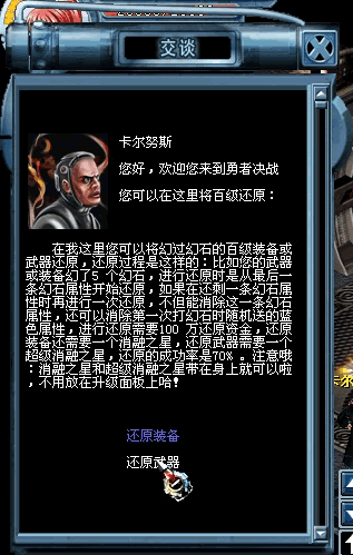 在菲利普银行(即天银行)卡尔努斯处能够对幻错了幻石的百级武器装备进行还原,还原顺序是从最后一条幻石属性开始,每次还原掉一条,当某件百级武器装备上只剩下一条幻石属性时,不但这条幻石属性能够被还原掉,而且第一次对这件百级武器装备附加幻石属性时额外附加的那条属性也会被还原掉,还原也有成功率,还原失败时,仅还原所需的各种材料消失,百级武器装备不会伴随消失: