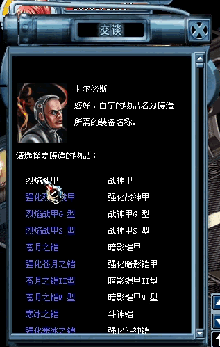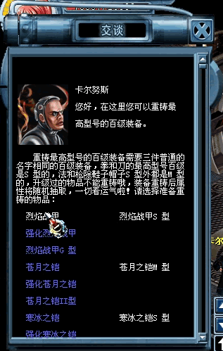百级装备的铸造以及武器的重铸其实都非常简单,只需前往菲利普银行(即天银行)卡尔努斯处,然后点铸造百级装备或重铸百级装备或重铸武器就行,无论铸造还是重铸,基本上都是需要三件名称相同但没有升级过的任意属性武器装备,铸造或重铸也有成功率,成功时会产生随机属性,不过这里面其实暗藏着玄机:能够出现相同属性,即可能出现6技能武器或6速武器以及150血装备等,失败时,武器装备都会伴随消失。