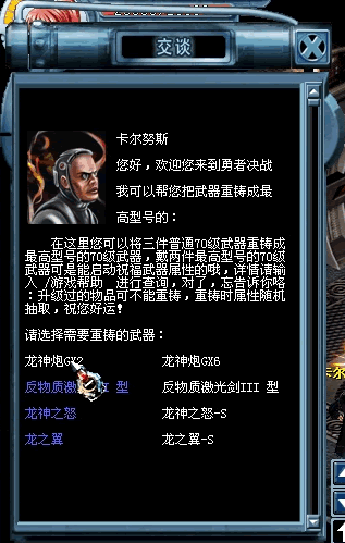 武器重铸与百级装备重铸大同小异,武器重铸能够将不是最高型号的武器重铸为最高型号的,武器重铸同样需要三件名称相同且没有升级过的任意属性非最高型号武器,也是将它们放在物品栏中即可,用于重铸的非最高型号武器名称极其重铸成为的最高型号武器名称如下表: